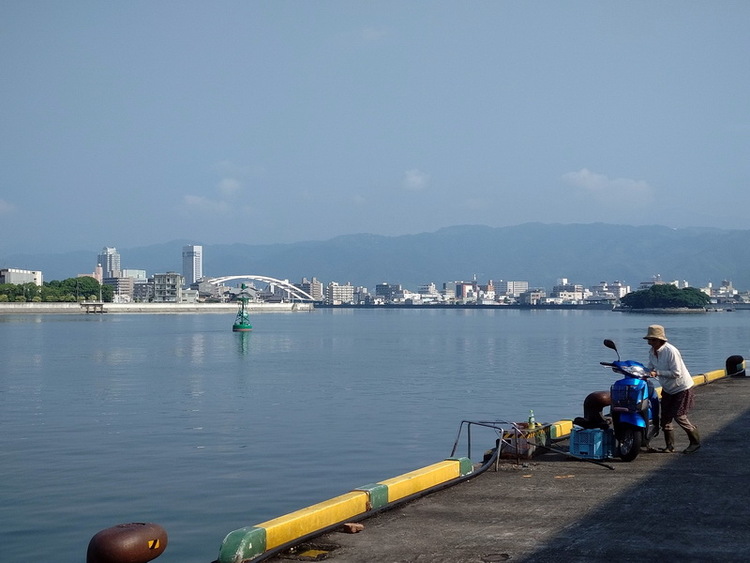 いつものように岸壁側に出ると、釣りをしていた人がバイクでどこかへ ...。