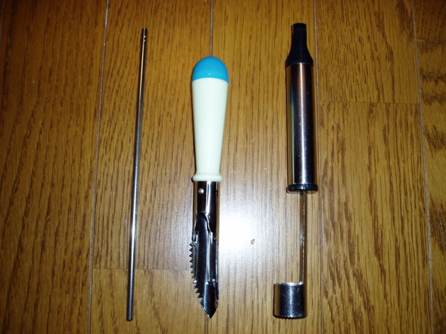 ・右の芯抜き??は、詰めた菌糸ビンの中央へ穴を開けるのに活躍します!以上3点、すべて100円ショップで調達しました。